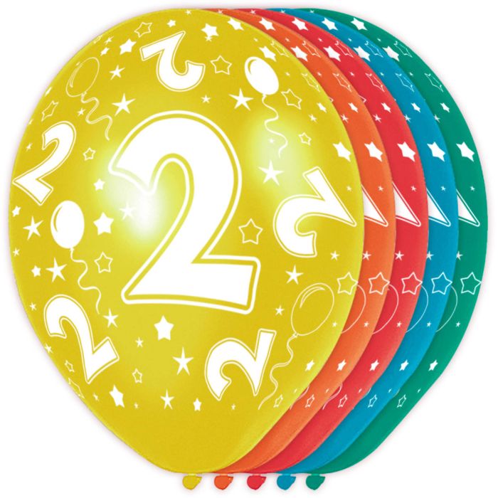 2 Jaar Verjaardag Ballonnen - 5 stuks. Inhoud: 5 latex ballonnen. Bijvoorbeeld te gebruiken tijdens de volgende feestgelegenheid/feestgelegenheden: verjaardag, kinderfeestje, jubileum. Elke ballon is 12 inch/30 cm. Het artikel is gemaakt van latex.