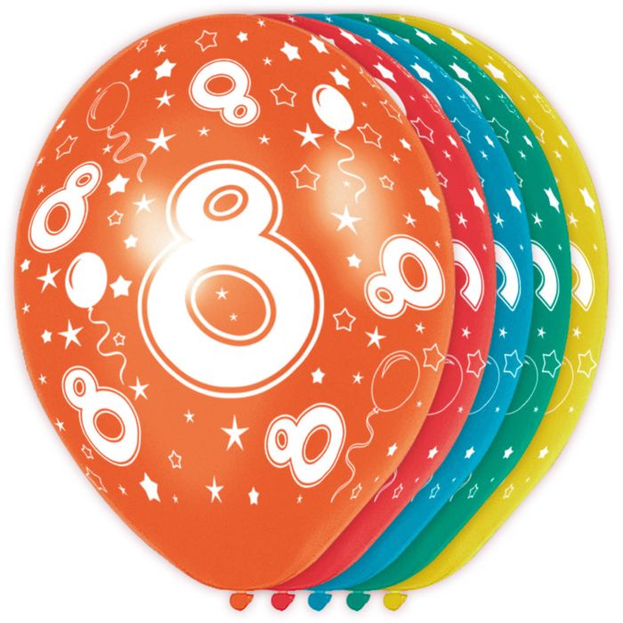8 Jaar Verjaardag Ballonnen - 5 stuks. Inhoud: 5 latex ballonnen. Bijvoorbeeld te gebruiken tijdens de volgende feestgelegenheid/feestgelegenheden: verjaardag, kinderfeestje, jubileum. Elke ballon is 12 inch/30 cm. Het artikel is gemaakt van latex.