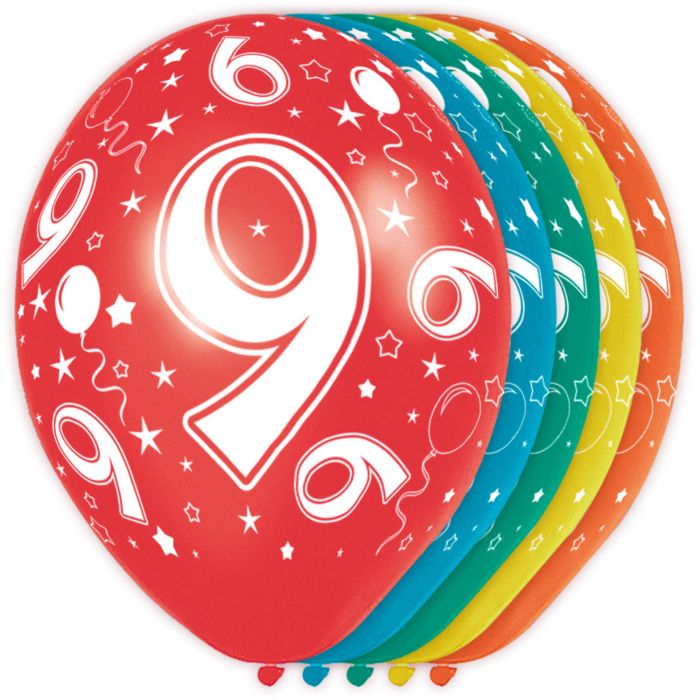 9 Jaar Verjaardag Ballonnen - 5 stuks. Inhoud: 5 latex ballonnen. Bijvoorbeeld te gebruiken tijdens de volgende feestgelegenheid/feestgelegenheden: verjaardag, kinderfeestje, jubileum. Elke ballon is 12 inch/30 cm. Het artikel is gemaakt van latex.
