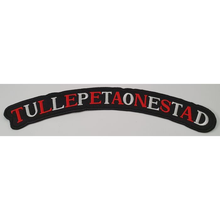 Strijk embleem zwart met rood-wit letters " TULLEPETAONESTAD" erop geborduurd. 3cm x 3cm