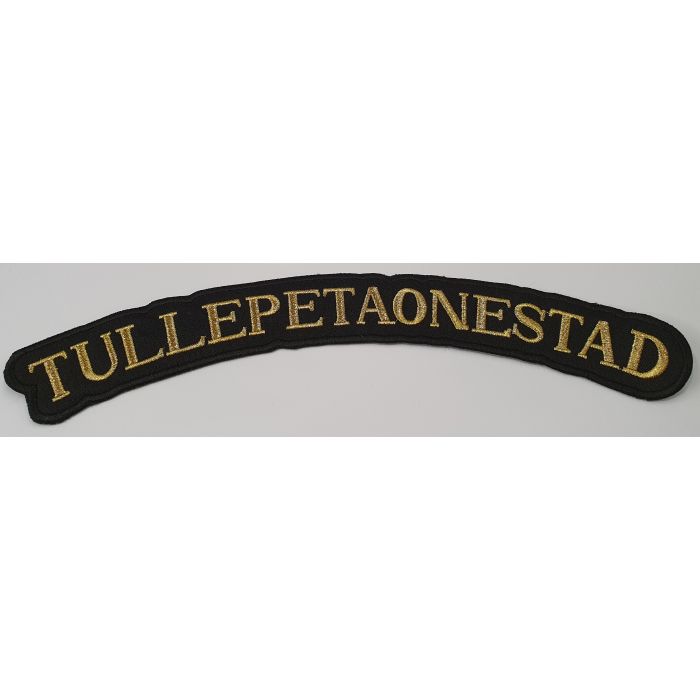 Strijk embleem zwart met gouden letters " TULLEPETAONESTAD" erop geborduurd. 3cm x 3cm