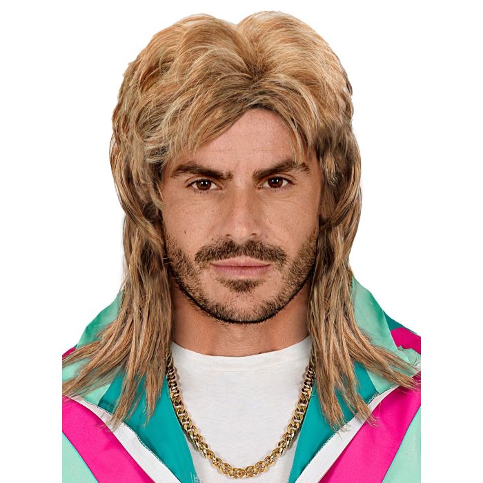 Een foute bruine heren pruik met lange mat. Precies zoals we onze haren in de jaren 8 en 9 hebben gedragen. Lekker fout met een gouden ketting erbij!