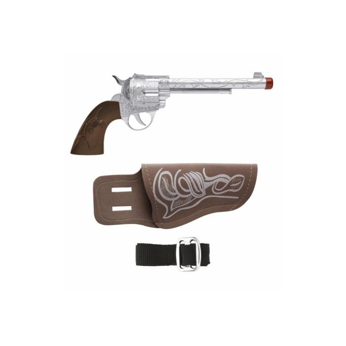 Dit cowboy pistool is van plastic en is 3 cm lang. Het cowboy pistool kan in de holster gedaan worden. De holster heeft een riem van 13cm. lang. maar de holster kan ook aan je eigen riem vastgemaakt worden.Let op! Er kunnen geen klappertjes in dit cowboy pistool!