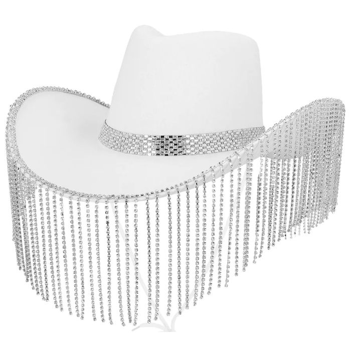Deze bijzondere Showgirl cowboyhoed is een unieke accessoire voor een festival outfit, cowboy Carnavalkostuum of vrijgezellenfeest en voegt glamour toe aan het stoere Western thema. De mooie witte hoed heeft een band met glimmende steentjes en rondom allerlei glimmende slierten voor een mysterieus effect.