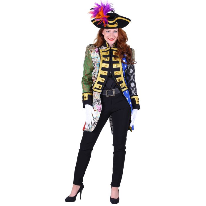 Dames AdmiraalsjasEen gevoerde Carnavalsjas voor Dames, met epauletten, manchetten, afgewerkt met goud band. De jas sluit met een korte rits aan de voorkant, en heeft 2 steekzakken. Iedere jas is UNIEK doordat deze jassen uit diverse Print stof, Jaquard stof, Glansgaren bestaat.