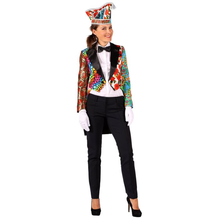 Lapjes Dames CarnavalsjasIeder jas is UNIEK doordat de Carnavalsjassen voor dames uit een Mix van verschillende stoffen bestaat. Zoals, diverse Print stof, Jaquard stof, Glansgaren. De slipjas is kort aan de voorkant en lang aan de achterkant. De jas is gevoerd en heeft een binnenzak.