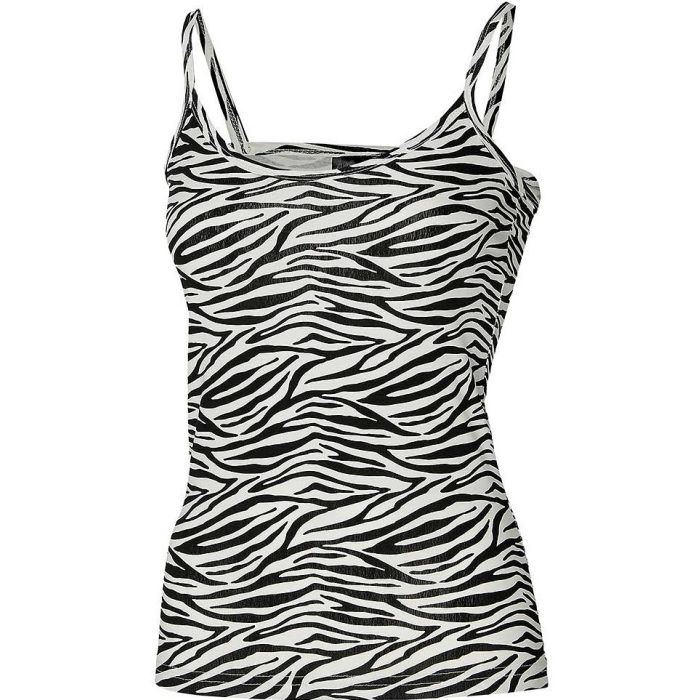 Dit TOP (pertje) van een singlet is heel tof in combinatie met kleding & accessoires in jaren 8/9 of Punk style. Denk daarbij aan een toffe combinatie met onze hotpants in zebra print, petticoat erover, handschoenen erbij..... Natuurlijk steel je met Carnaval ook de show....Dit spaghetti topje in Zebra print is gemaakt van katoen. Het zwart/wit shirt topje heeft een lengte van 38cm.