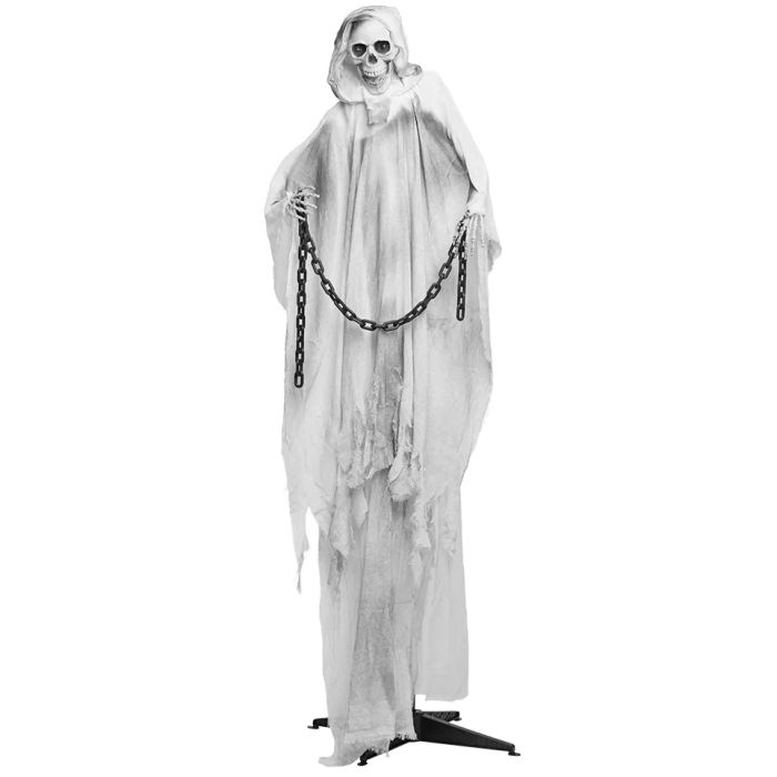 Pas op! Als je te veel geluid maakt, komt deze geketende geest tot leven. Met zijn grootte van 19 cm, griezelige geluiden, enge bewegingen en rode ogen is dit skelet een griezelig verschijning die perfect tot zijn recht komt als Halloween versiering of als decoratie in een spookhuis.