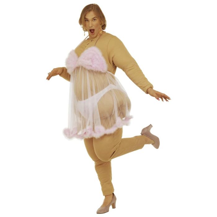 Dit dikmaakpak bestaat uit 2 delen. De slip zit aan het kostuum vast, het japonnetje is los. Over dit kostuum kun je dus andere kleding dragen waardoor je steeds met een ander carnavalspak voor de dag kan komen. Het dikmaakpak is in 1 maat. Past altijd voor de gemiddelde man of dame!