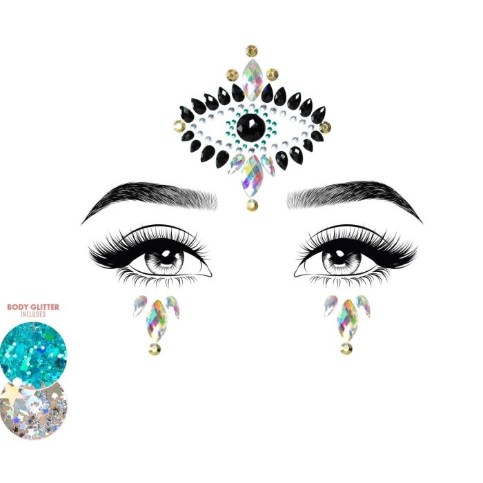 Divinity Face Jewels Face Jewels maken jouw Party look compleet. De mooie Zwarte en Zilveren stenen van Leg Avenue zijn een ware EYE Catcher. Draag ze naar Carnaval, een feestje/festival, en steel de SHOW. Extra erbij, losse bodyglitters in 2 kleuren: Aqua blauw en zilver.Je kunt de face Jewels direct op de huid bevestigen, of herbruikbaar, gebruik daarvoor de Grimas Wateroplosbare lijm.