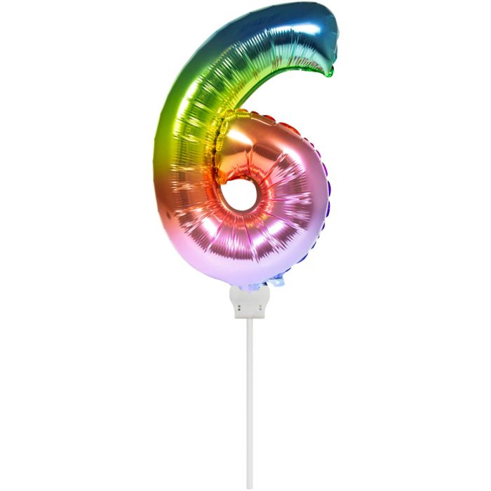 Folieballon Regenboog Cijfer 6 Afmeting: 36cm. Leuke mini folie ballon in een regenboog kleur. Het draagstokje is tevens het opblaasrietje. De folie ballonnen sluiten vanzelf door het ingebouwde ventiel. Leuk als versiering voor in een boeket of ander kado. Mocht je meer vragen hebben over onze collectie ballonnen bel gerust onze medewerkers in onze Feestwinkel in Roosendaal. tel. 0165-537808.