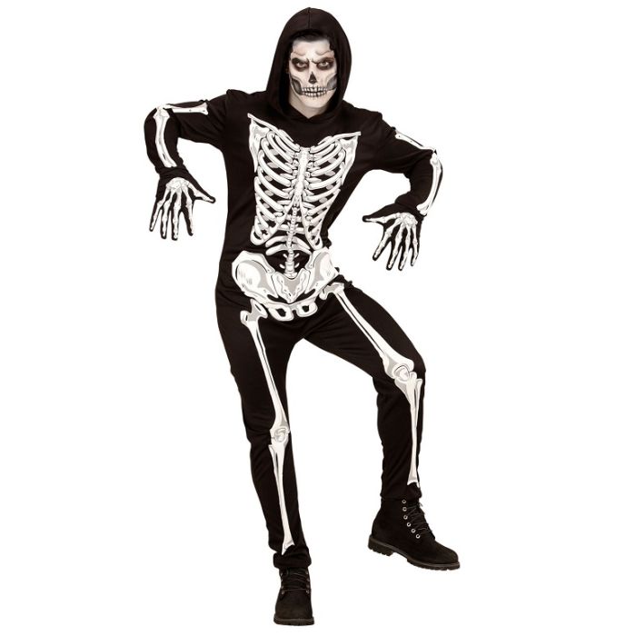 Dit Halloween pak bestaat uit 3 delen. Het skelet overall met capuchon en 2 losse skelet handschoenen.Let op! Bestel eventueel een maatje groter. Overalls vallen meestal klein uit. een grotere maat zal comfortabeler zitten.