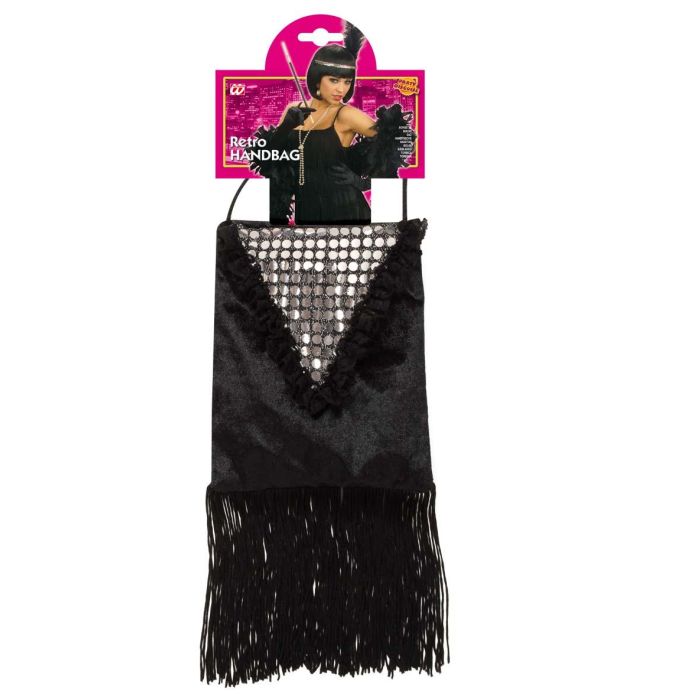 De sjieke zwarte handtas met ritssluiting is afgewerkt met zilveren stof en zwarte franje onderaan. De tas matcht bij alle Charleston jurkjes.