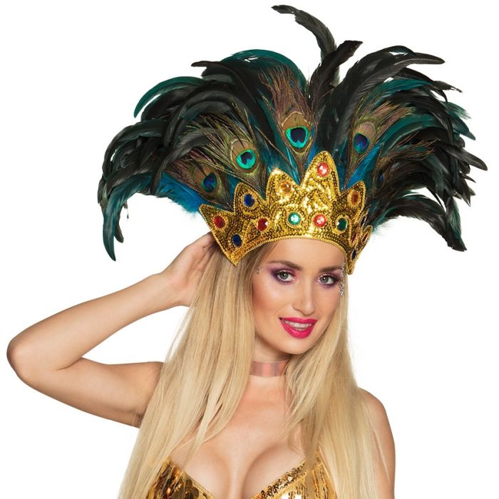 Maak je klaar om te stralen tijdens het Carnaval met onze prachtige Hoofdtooi Pauwenkoningin. Deze Braziliaanse hoofdtooi is een echte blikvanger die je outfit naar een hoger niveau tilt. De mooie veren zorgen voor een speelse en kleurrijke uitstraling, perfect voor het feestseizoen!