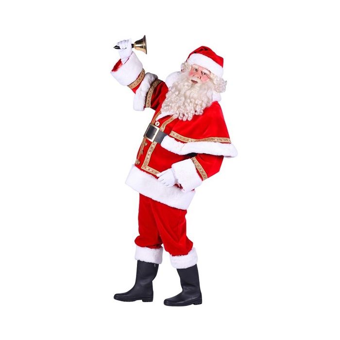 Luxe Kerstman kostuum van 1% polyester Fluweel. Het Kerstman kostuum bestaat uit een gevoerde jas incl. cape, afgezet met prachtig imitatiebont en 4cm brede goudgalon, mooie knopen met een rendierkop. De kerstman broek heeft een elastische taille en erbij zit een lange kerstman muts en een 8cm brede ceintuur.