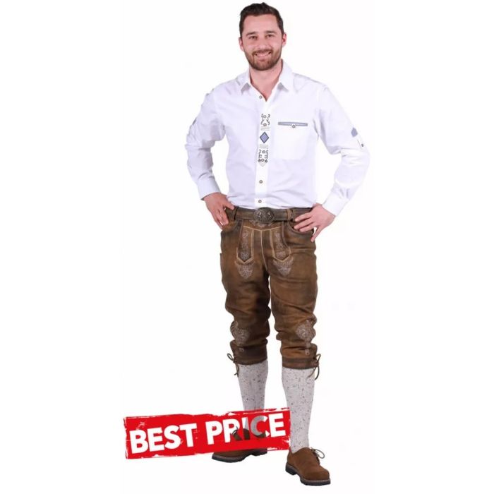 Maak je klaar voor het Oktoberfest met de prachtige Lederhose 3/4 Jurgen in middelbruin! Deze kniebroek, gemaakt van echt leder, is niet alleen van topkwaliteit, maar ook een echte blikvanger. De rijk uitgevoerde borduursels en de stijlvolle hoornen knopen geven je outfit een authentieke uitstraling. Perfect voor een avond vol gezelligheid!