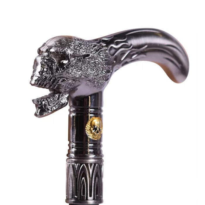 Deze prachtige wandelstok heeft een zwarte metalen stok met een rubberen anti slip dop aan de onderkant. De zilveren metalen handgreep heeft een doodskop aan de voorkant.