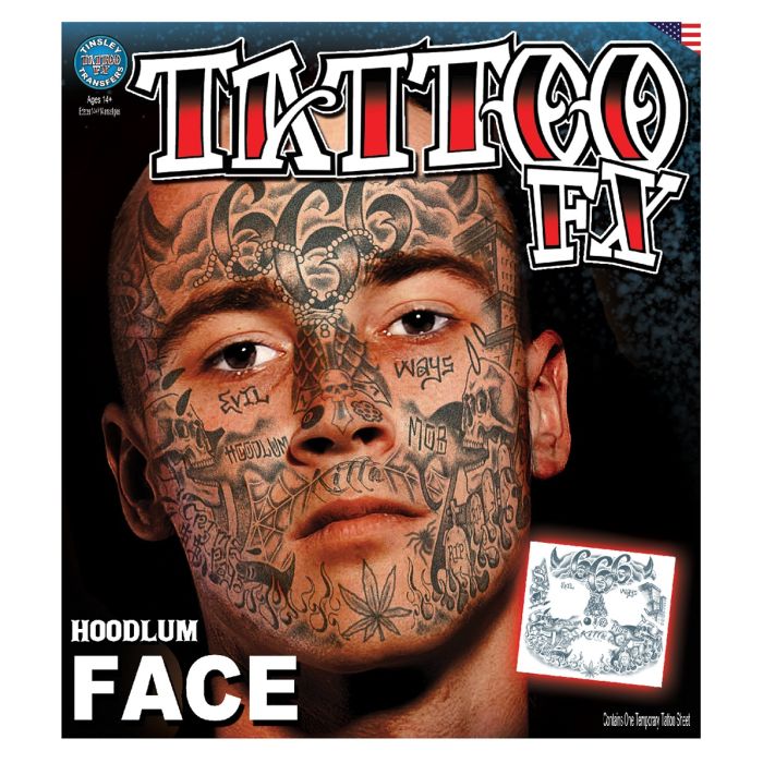 De nep face tattoo Hoodlum is een must-have voor Halloween en andere evenementen. Deze tijdelijke tattoo zorgt voor een opvallende uitstraling en is eenvoudig aan te brengen. Met een realistisch ontwerp valt je look zeker op.