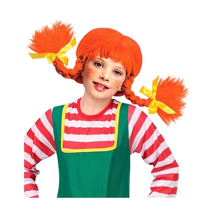Deze Pippi Langkous pruik voor kinderen is niet zoals op de foto rood, maar oranje van kleur. Echt de kleur voor Pippi Langkous!In staartjes van de pruik zit ijzerdraad, waardoor je die elke kant op kan buigen.