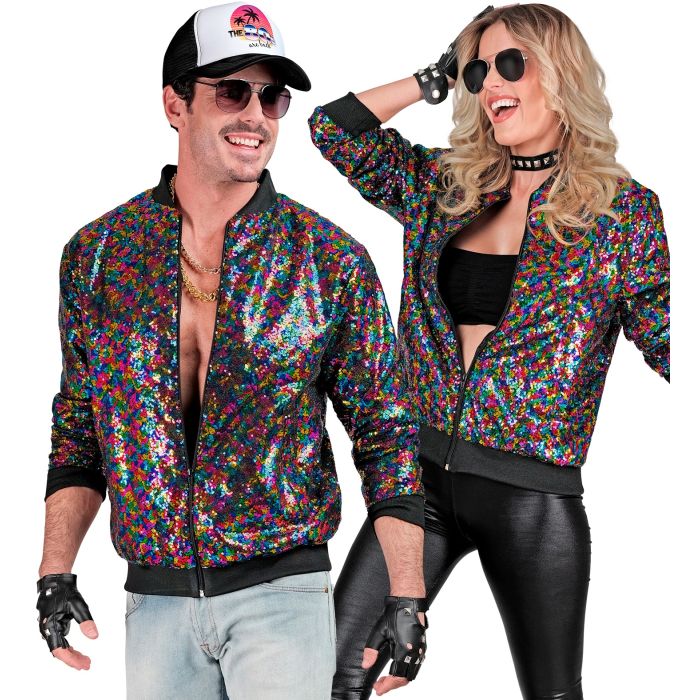 Maak je klaar voor de foute Party met ons trendy unisex Bomberjack in multicolor! Dit opvallende jack, gemaakt van paillettenstof met een funky animal print, is perfect voor zowel dames als heren. Het geeft je outfit een speelse flair en zorgt ervoor dat je in het middelpunt van de belangstelling staat.