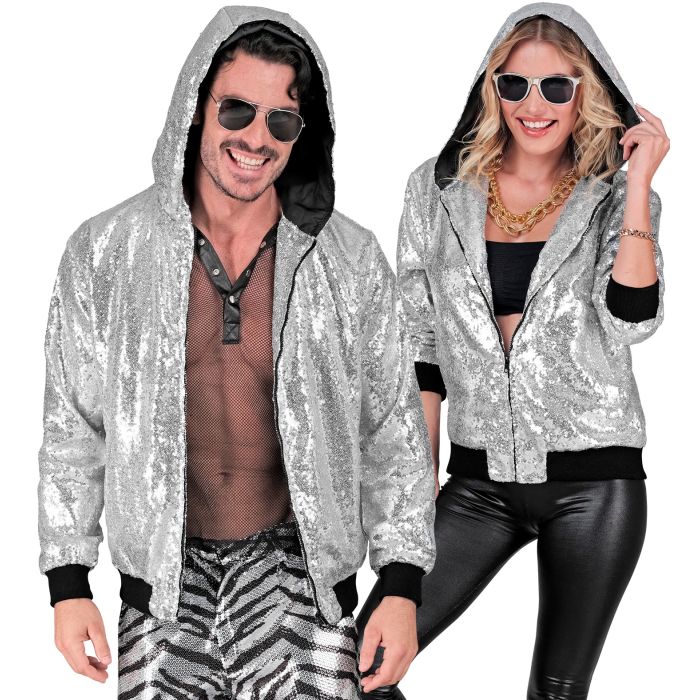 Maak je klaar voor de Foute Party met ons geweldige unisex Bomberjack met capuchon in een sprankelend zilver! Dit bomberjack is perfect voor zowel dames als heren en zorgt voor een fashion statement dat je niet wilt missen. De paillettenstof geeft je outfit een feestelijke glans, ideaal voor carnaval of festivals.