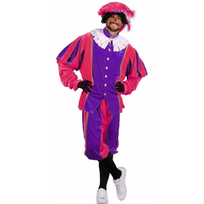 Pieten pak populair in de kleur paars-pink is een mooi Pieten kostuum in een gebreide polyester fluwelen kwaliteit de prijs/ kwaliteit verhouding van dit kostuum is geweldig. Het Pieten kostuum bestaat uit 3 delen: De broek, shirt en baret. Alle losse Pieten accessoires zoals veren, maillots, handschoenen etc. zijn te bestelling in onze webshop. Mocht je in de gelegenheid zijn dan is een bezoek aan onze Feestwinkel in Roosendaal aan te raden. Wij hebben van 1 september t/m 5 december een speciale Sinterklaas afdeling waar je in alle rust je Sinterkaas artikelen kan uitzoeken. Je bent meer dan welkom!