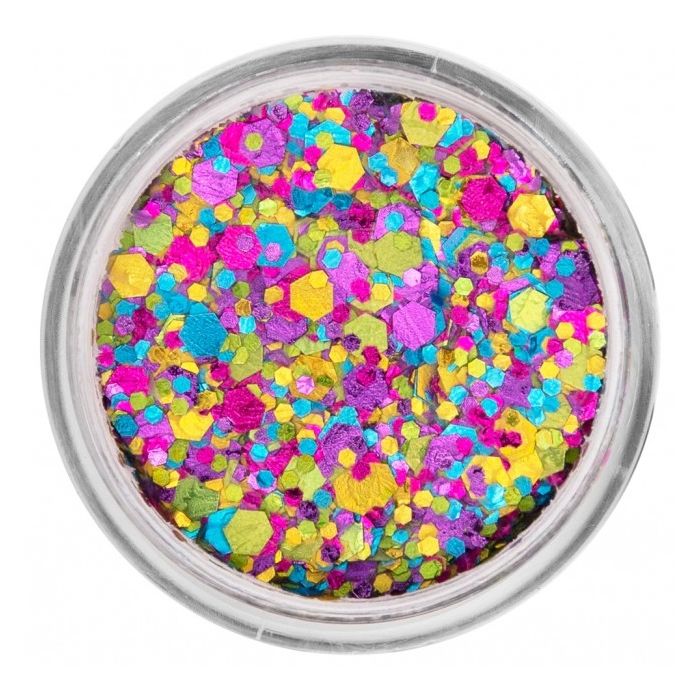 Te gekke glitters van het met PXP. Je kan het zo opbrengen op je huid en makkelijk te combineren met andere kleuren. De glitters zitten verpakt in een rond plastic doosje.