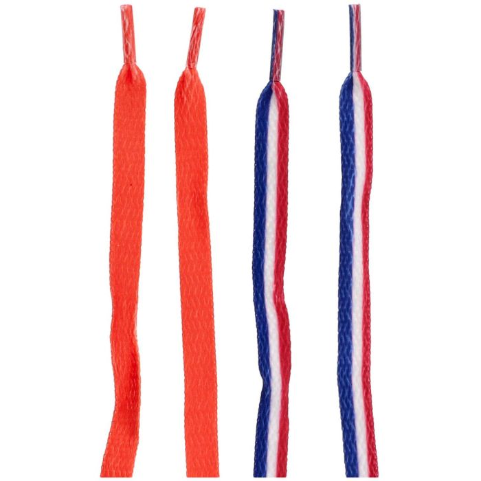 Schoenveters Holland 2 setjes 91cm.Feestelijk gestrikt! Schoenveters - Oranje/Rood-Wit-Blauw.2 setjes - 91 cm. Inhoud: 2 oranje veters en 2 roodwitblauwe veters. Bijvoorbeeld te gebruiken tijdens de volgende feestgelegenheid/feestgelegenheden: Koningsdag, Voetbal. Met deze feestelijk gestrikte veters wordt het overal een feestje. Er zitten twee setjes veters in een verpakking. Een setje oranje veters en een setje roodwitblauw. Alle veters zijn 91 cm lang. Dit artikel is gemaakt van polyester.