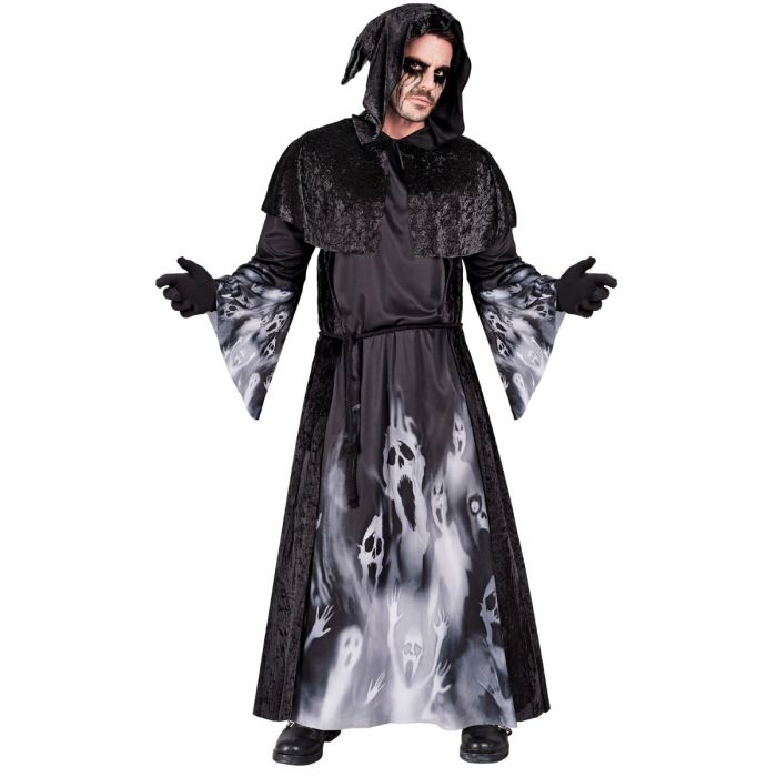 Het kostuum bestaat uit een lange zwarte jurk met een griezelige kap, die je een mysterieuze uitstraling geeft. De details en afwerking maken het geheel perfect voor een angstaanjagende look. Of je nu gaat voor een spookachtige sfeer of een meer sinistere uitstraling, dit kostuum is de ideale keuze.