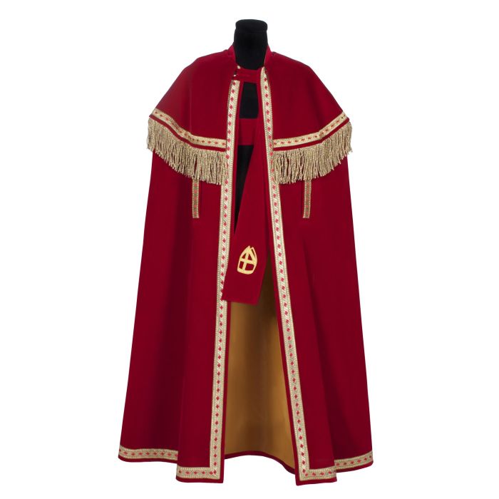 Sinterklaas pak Stefan 2dlg. licht rood (smalle mantel). Dit Sinterklaas kostuum bestaat uit 2 delen, een smalle mantel en de stola. De habijt en mijter zijn los te bestellen in onze webshop.Let op! Dit Sinterklaas Kostuum is een versie van de Sint Stefan.Het Sinterklaas pak is gemaakt van mooi echt fluweel en luxe afgewerkt!