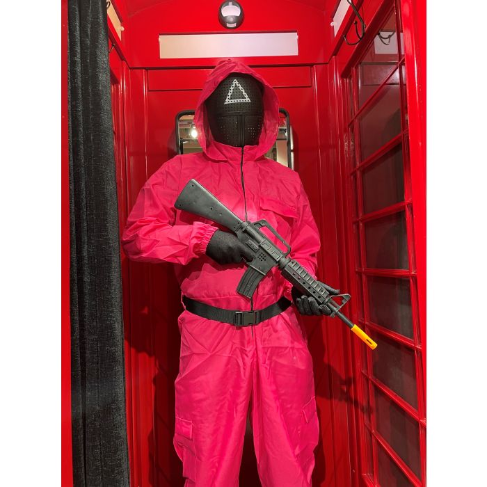 Guard Squid Game verkleed kostuum (exclusief masker). De hitserie van Netflix, Squid Game! Deze bewaarders pakken bestaan uit: een rood/roze overal uit 1 stuk, een verstelbare zwarte riem, een paar zwarte handschoenen. De overal heeft een vaste capuchon, ritssluiting aan de voorkant, een borstzak aan de voorkant, en twee zakken aan de zijkant op de benen.De maskers met de Driehoek, Ronde, Vierkant teken zijn los verkrijgbaar. Hoe meer hoeken in de afbeelding hoe hoger de rang. Draag je een masker met een rond teken dan ben je zeg maar het hulpje. Draag je een masker met een vierkante afbeelding dan heb je een leiding gevende functie. De leider blijft natuurlijk de Front man met het effen zwarte masker.