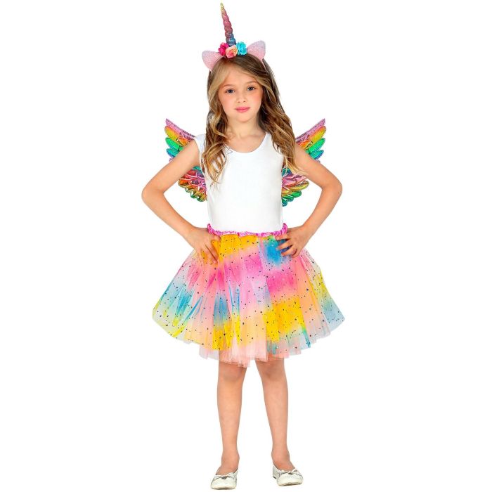 Het Unicorn verkleed setje bestaat uit de unicorn vleugels, een kleurige petticoat een Unicorn diadeem.