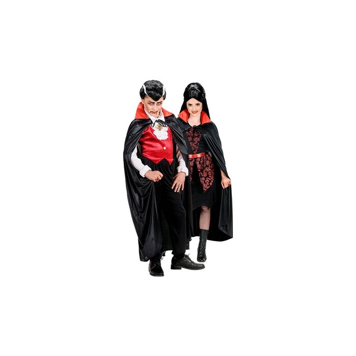 Een satijnen Dracula vampieren cape in de traditionele kleuren rood-zwart. De Vampieren cape is geschikt voor meisjes als jongens en komt ongeveer tot de enkels (11cm).