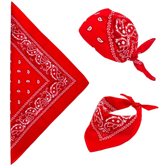 Deze rode zakdoek met motief kan je op heel veel verschillende manieren dragen. Knoop hem rond je nek of draag hem via de achterkant van je hoofd omhoog geknoopt in een strik. De zakdoek is hier groot genoeg voor, de afmetingen zijn namelijk 55x55 cm.