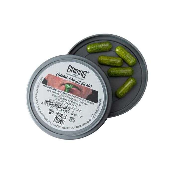 De Grimas Zombie Capsules zijn capsules van plantaardige oorsprong gevuld met gekleurd poeder, dat bij vermenging met speeksel een vloeibare substantie vormt. De capsules worden gebruikt voor diverse special effects bij film/theater en voor Halloween.Neem de capsule in de mond (de capsule smelt langzaam) en bijt erop wanneer het effect moet worden getoond. Door het ingredieent citroenzuur wordt de aanmaak van speeksel gestimuleerd, waardoor er een licht schuimend, vloeibaar effect ontstaat.