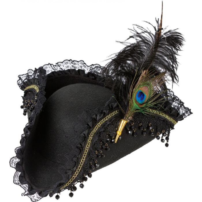 Super kwaliteit piraten driespits hoed met extra detail de veren. De zwarte piraten hoed is gemaakt in 1 maat. Wij verkopen eventueel hoeden verkleiners om de hoed passend te maken.