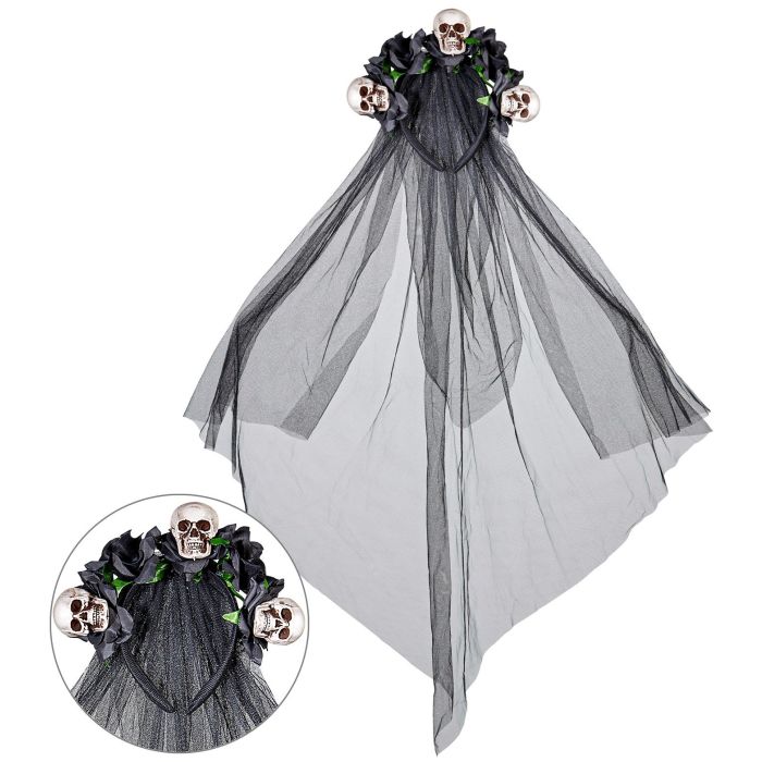 Een zwarte diadeem met zwart gaan aan de achterkant. Op de diadeem zitten 3 doodskoppen leuk afgewerkt met zwarte rozen. De Halloween diadeem is in 1 maat. Past altijd doordat de diadeem meerekt.